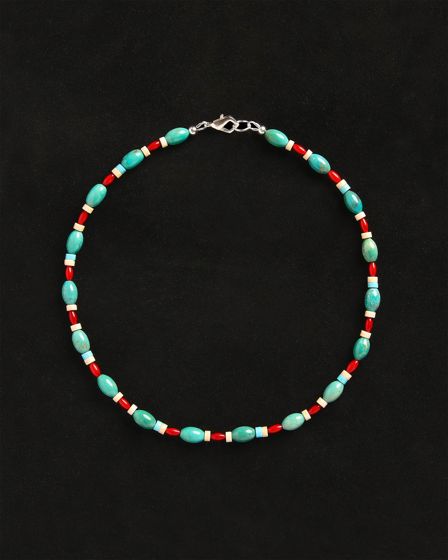 A delicate necklace hand strung with various turquoise, river stone and coral beads. Featuring a sterling silver closure.