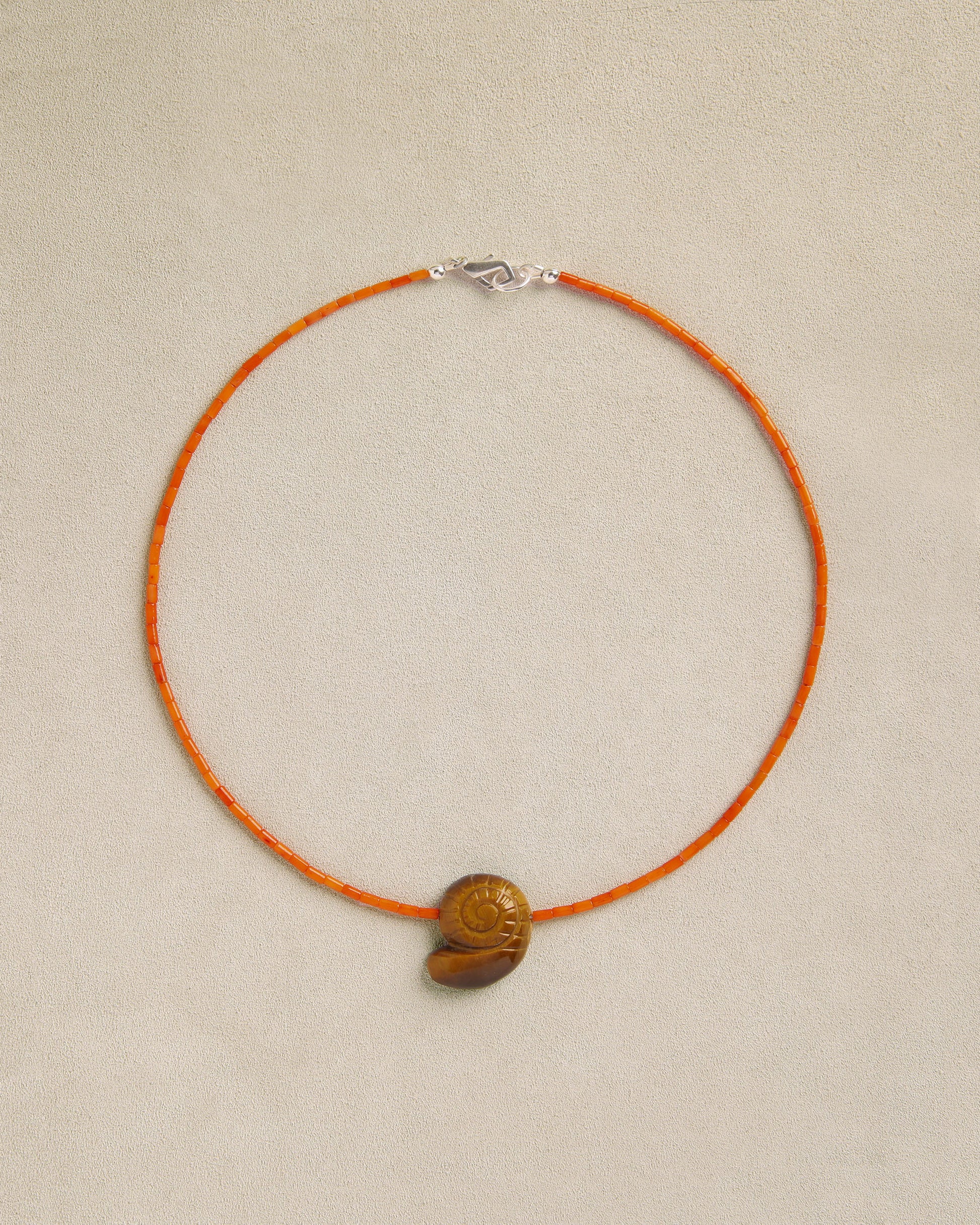 A hand carved tigers eye nautilus pendant. Hand strung with dyed orange coral beads featuring a sterling silver closure.
