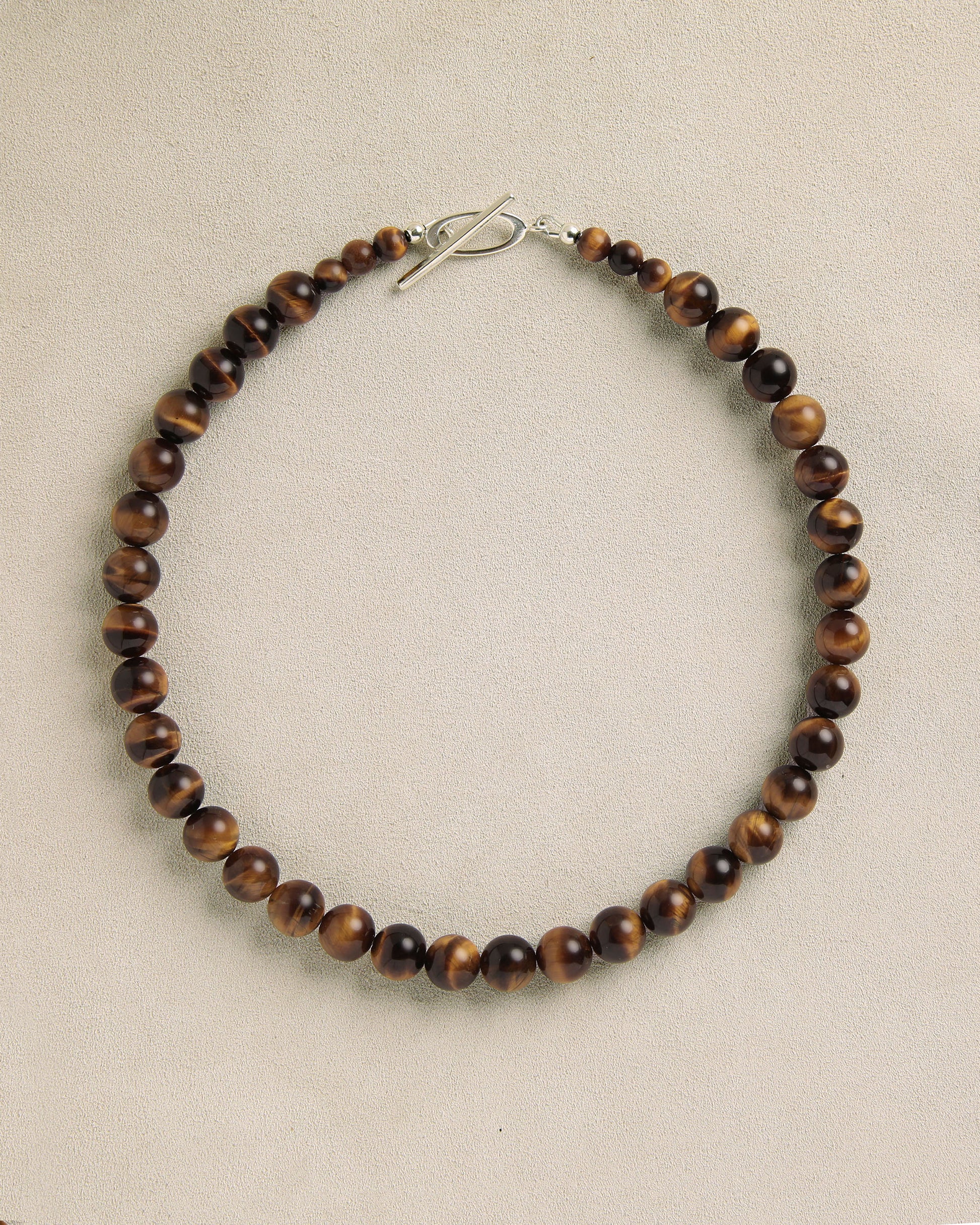A fitted stone collar featuring tigers eye beads with a unique sterling silver toggle closure.